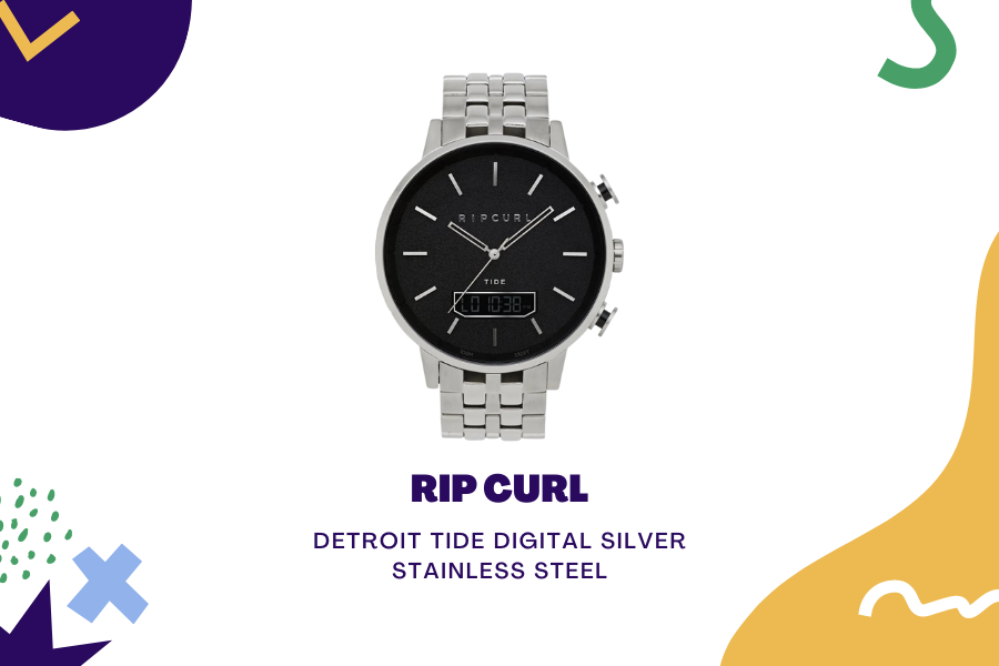 Jam tangan tahan air tapi juga kelihatan stylish di luar air? Yang kamu perlukan adalah jam tangan pria Rip Curl Detroit Tide Digital Silver Stainless Steel WatchIt’s stylish enough to wear to work. Jam ini memiliki desain industrial dengan strap open link yang unik. Memiliki pula dual movement, analog dan digital. Bisa dipakai hingga tekanan 100 m, jadi nyaman sebagai partner berenang dan menyelam di area dangkal, nih.