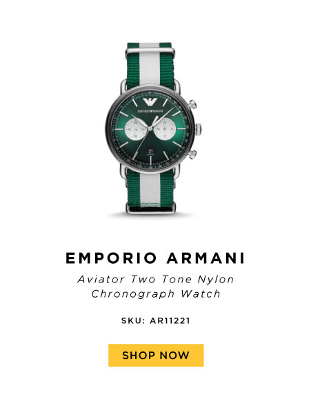 Saat jalan-jalan di kota metropolis ini, sematkan jam tangan Emporio Armani Aviator Two Tone Nylon Chronograph Watch di tanganmu. Dibuat untuk penikmat jam tangan mewah, jam tangan chronograph berwarna hijau emerald ini memiliki diameter dial 43mm dengan warna hijau dan stick index berwarna silver. Yang membuatnya makin stand-out, jam yang memiliki two-tone nylon strap (hijau dan putih) disempurnakan dengan chronograph movement. Perfect match for stylish New York.