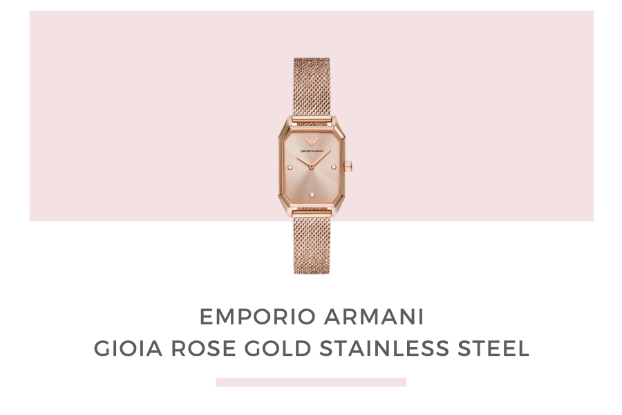 Kalau kamu sedang cari jam tangan warna cerah dan manis, juga terlihat mewah tapi tidak terlalu mencolok saat dipakai, Gioia will not disappoint you. Seri baru Emporio Armani ini memiliki case berbentuk kotak warna rose gold, dengan bracelet mesh stainless steel warna senada membuat jam tangan ini terlihat modern dan sophisticated. Dengan desainnya yang simple dan elegan, Gioia cocok dipakai untuk tampilan formal. Terlebih dengan ukuran dainty, jam tangan ini berperan sekaligus sebagai gelang.