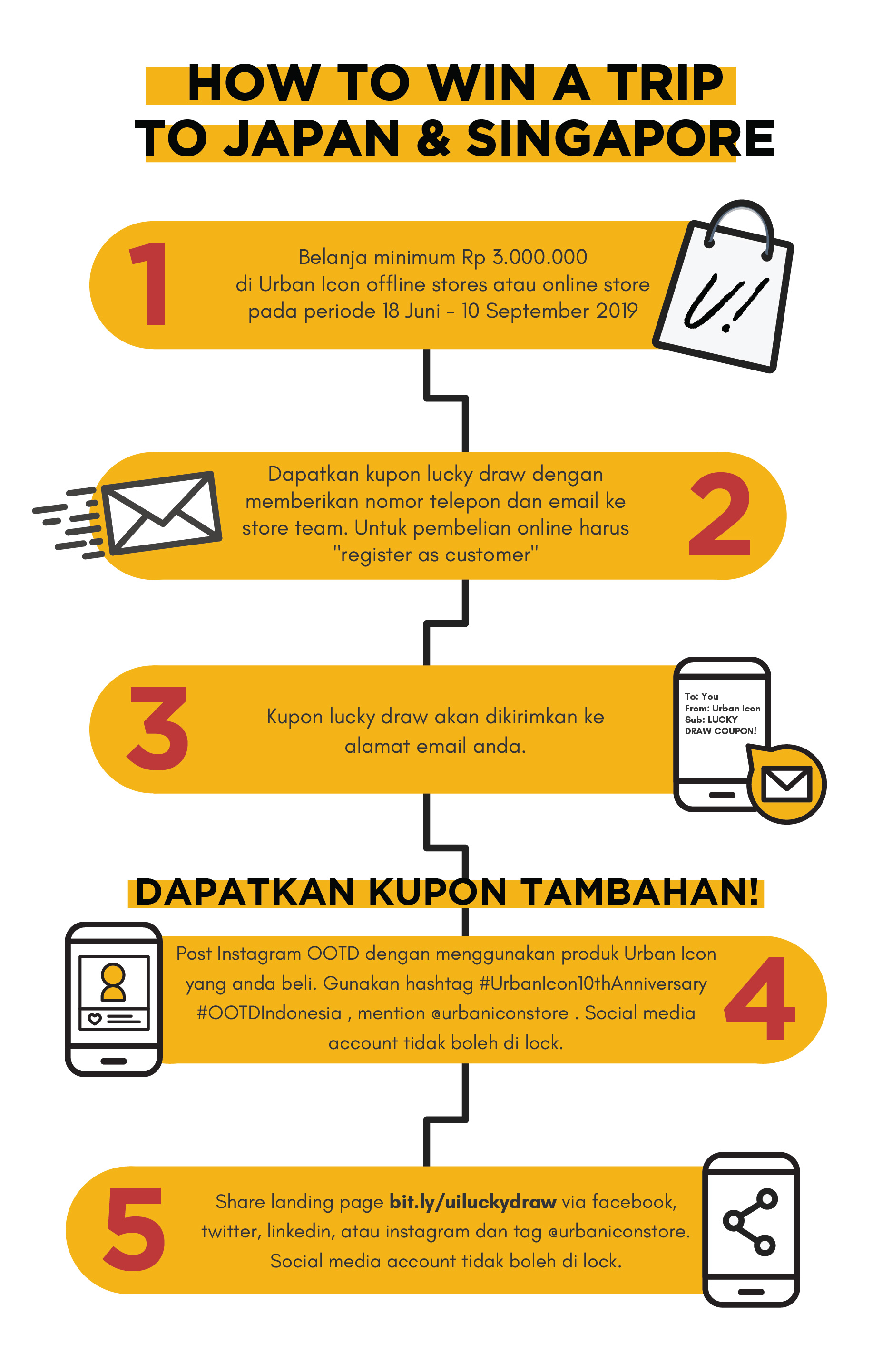 Dapatkan kesempatan untuk pergi ke Jepang dan menangkan undian hadiah Urban Icon #UrbanIcon10thAnniversary lainnya dengan nilai total 60 juta rupiah! Dalam rangka ulang tahun Urban Icon yang ke -10, Urban Icon akan memberikan hadiah spesial untuk customer yang berbelanja di Urban Icon online store maupun offline store kami dalam periode 18 Juni- 10 September 2019. Jangan lewatkan kesempatan untuk mendapatkan berbagai hadiah menarik berikut: