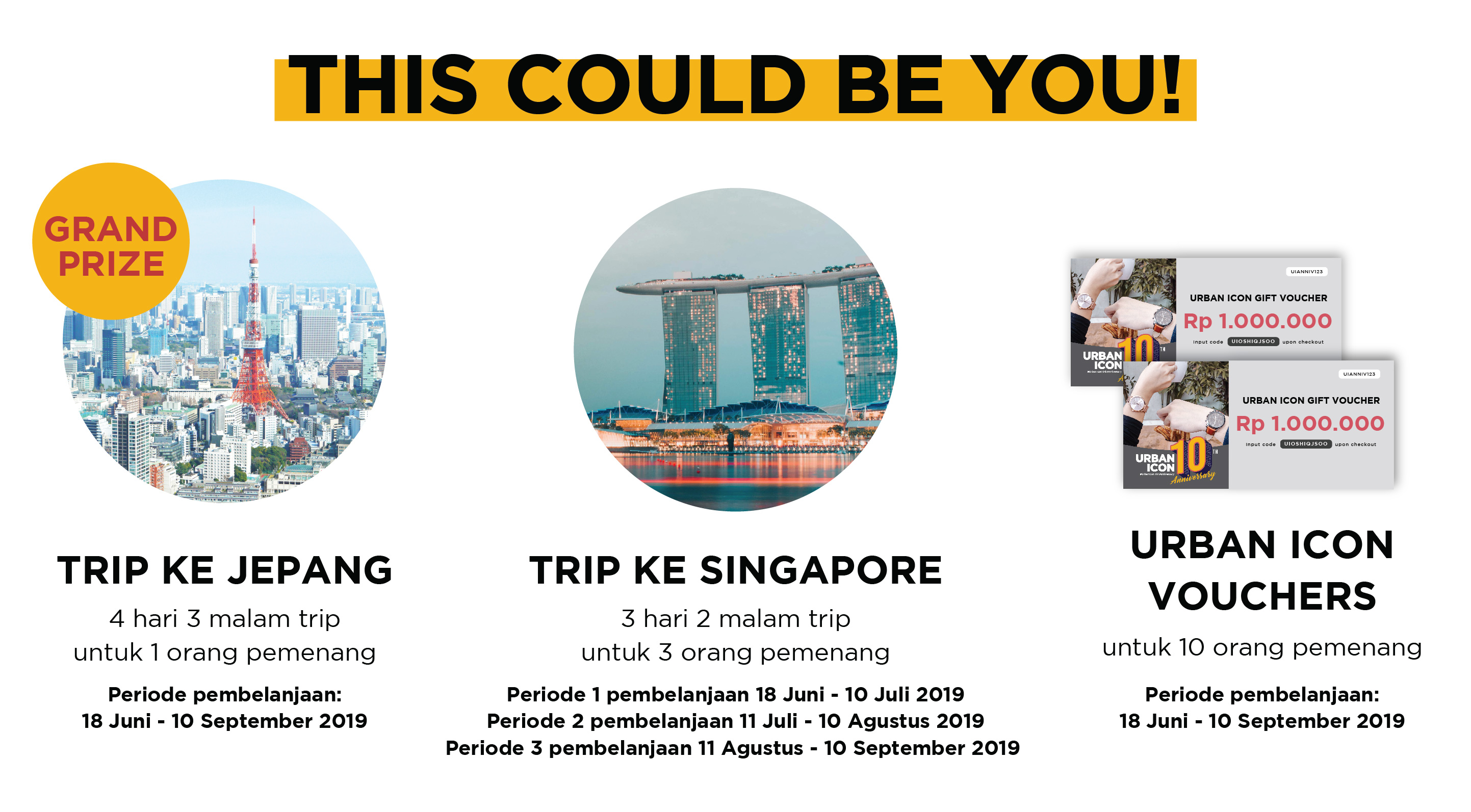 Grand prize: Hadiah 1 trip Japan untuk 1 pemenang dan 1 Urban Icon voucher @ Rp 1.000.000 untuk 1 pemenang. Periode pembelanjaan 18 Juni – 10 September. Pengundian hadiah 15 September. Periode keberangkatan September – Oktober 2019.