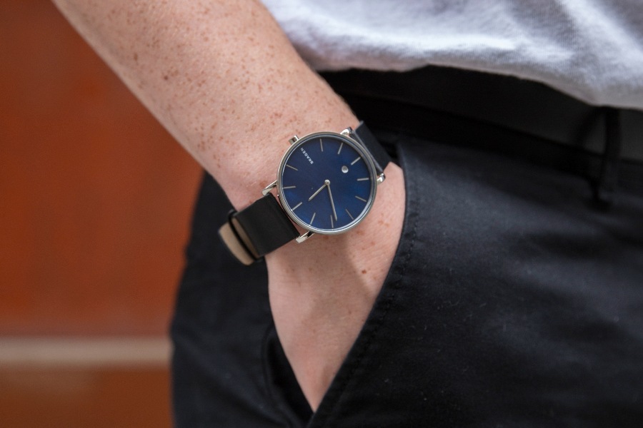 Jam tangan dengan strap kulit hitam selalu jadi pilihan klasik yang tidak pernah salah untuk pria. Apalagi ketika dikombinasikan dengan dial warna biru klasik seperti pada Skagen Hagen, klasik tapi trendy dan tetap versatile. Ditambah dial-nya terbuat dari mother of pearl yang memberi efek luminescent. Yang menariknya lagi, jam ini memiliki ketebalan case tertipis. Pria pecinta jam tangan desain minimalis yang classy harus punya.