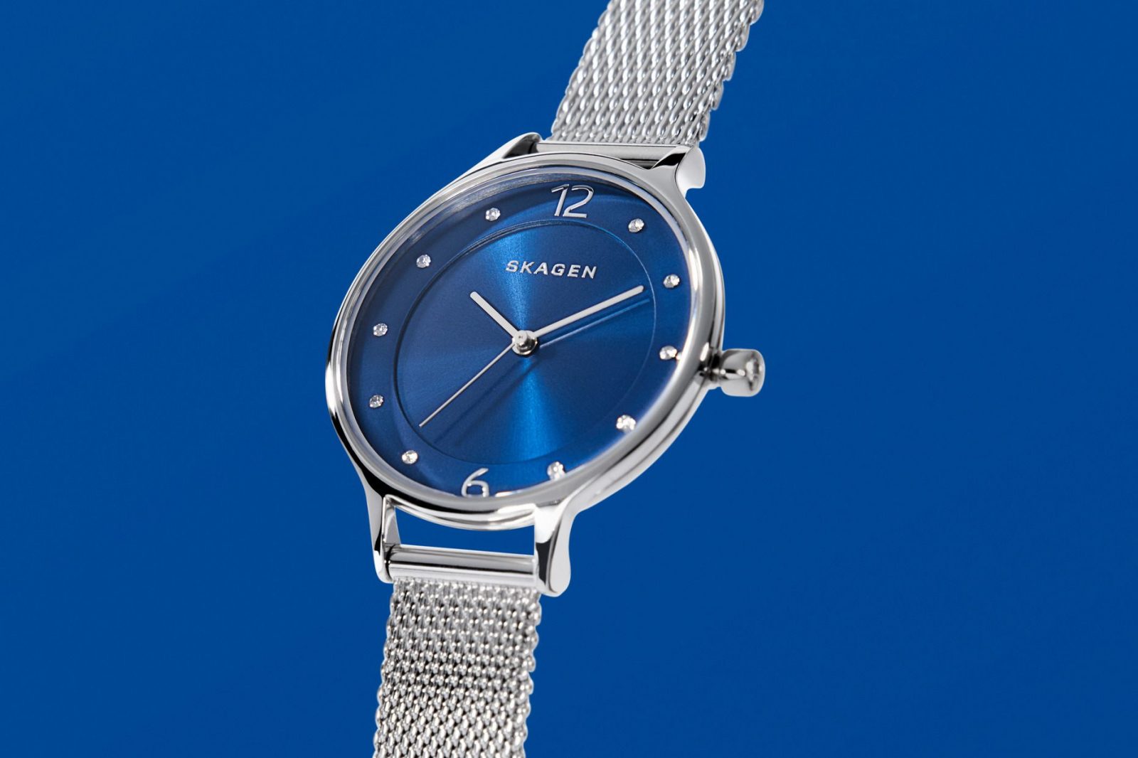 Simple, clean, and fashionable. Tiga kata untuk mendeskripsikan jam tangan Skagen Anita. Jam tangan analog untuk wanita ini memiliki kristal pada index-nya dan strap steel-mesh silver yang classy dan elegan. Cocok dipakai dengan outfit apapun. Dan bahkan karena desainnya yang minimalis dengan dial warna biru klasik yang memesona, jam tangan ini juga bisa jadi aksesori sempurna untuk casualwear.