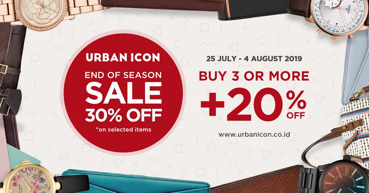 Belanja di Urban Icon offline dan online store dan dapatkan potongan harga sampai dengan 70% untuk produk pilihan kami! Jika kamu belanja 3 item atau lebih, kamu bisa mendapatkan tambahan potongan harga 20% (syarat dan ketentuan berlaku)! Belum puas dengan penawarannya? Bagi kamu pengguna kartu kredit Mandiri, akan ada tambahan potongan lagi harga sebesar 5%! Cek sekarang Urban Icon End of Season Sale!